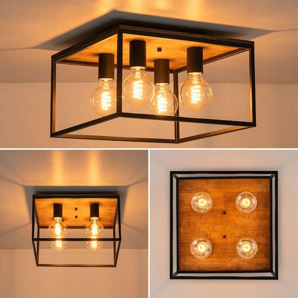 14.57 in. 4-Light Modern Farmhouse Matte Black Flush Mount Ceiling Fixture with Metal Frame and No Bulbs Included