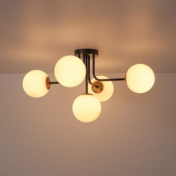 27.56 in. 5-Light Matte Black Industrial Semi-Flush Mount Modern Ceiling Light Sputnik Chandelier with White Glass Shade