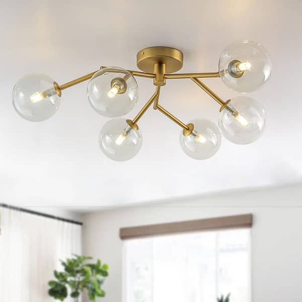 28.74 in. 6-Light Brushed Gold Mid-Century Modern Branch Bubble Globe Semi-Flush Mount Chandelier with Clear Glass Shade