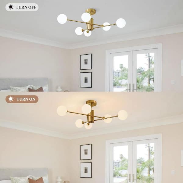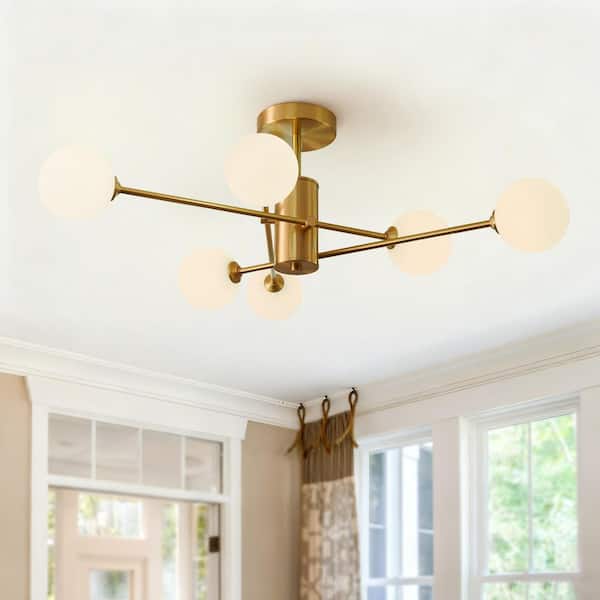 33.46 in. 6-Light Brass Modern Sputnik Chandelier Industrial Semi-Flush Mount Ceiling Light with Milk White Glass Shade