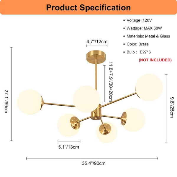 6-Light Brass Mid-century Modern Sputnik Chandelier for Dining Room with Frosted Glass Shades and No Bulbs Included