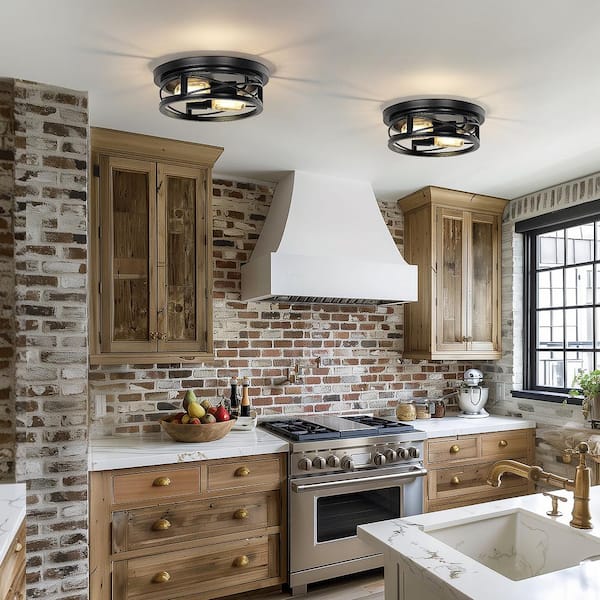 10.6 in. 2-Light Black Farmhouse Flush Mount with Drum Metal Cage Shade for Entryway Bedroom(2-Pack)