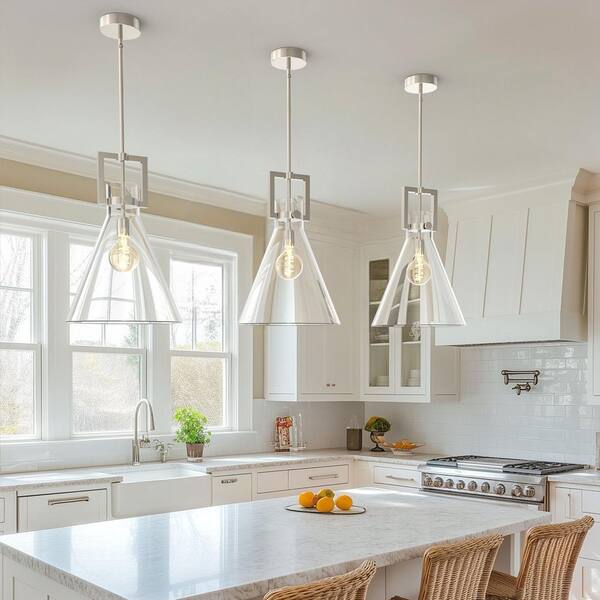 14 in. 1-Light Modern Cone Brushed Nickel Pendant Light with Clear Glass Shade for Kitchen Island