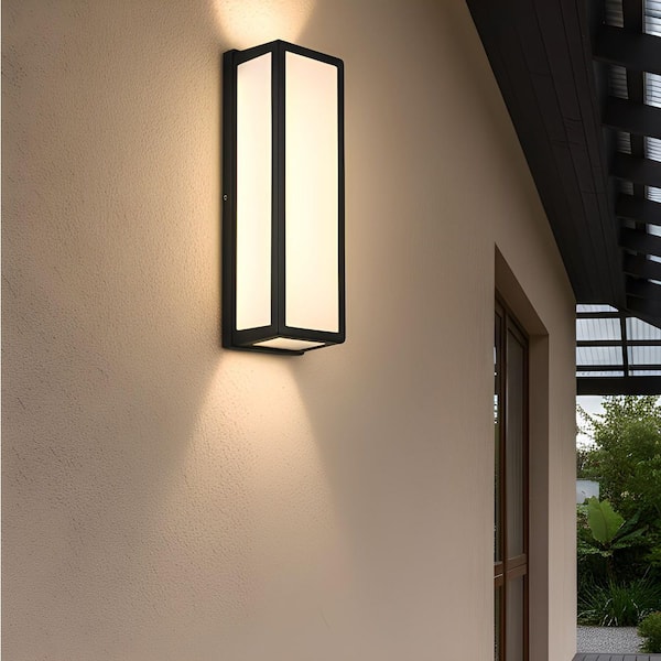 15.7 in. Black Cylinder Modern Integrated LED Indoor/Outdoor Porch Light Wall Lantern Sconce with White Shade