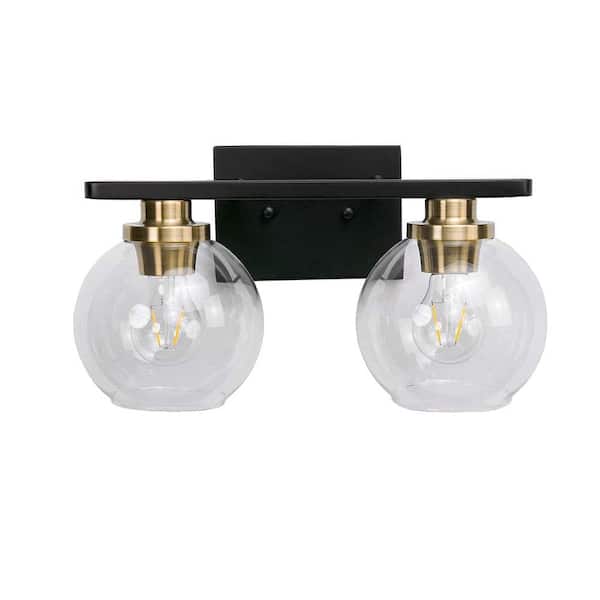 16 in. 2-Light Industrial Matte Black and Gold Bathroom Vanity Light, Open Globe Clear Glass Wall Sconce