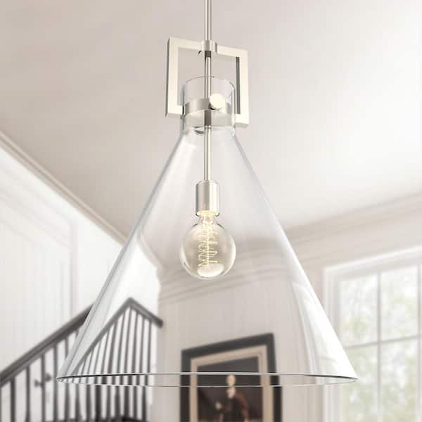 18 in. 1-Light Modern Brushed Nickel Bell Pendant Light with Clear Glass Shade for Kitchen, Dining, or Foyer Spaces