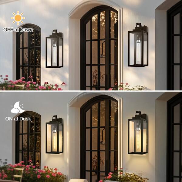 18 in. 2-Pack Large Black Dusk to Dawn Outdoor Waterproof Lantern Wall Lights with Clear Glass Shade T30 Bulbs Included