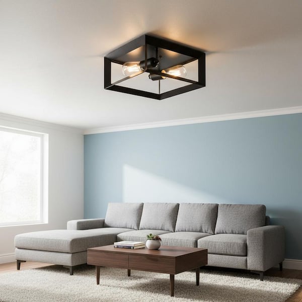 2-Light Black Farmhouse Caged Square Flush Mount Industrial Vintage Ceiling Lighting