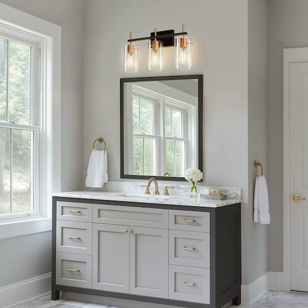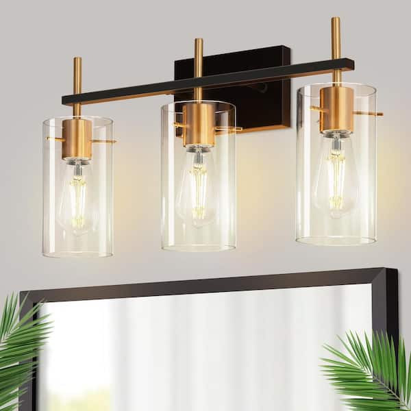 20 in. 3-Light Bathroom Fixture, Black and Gold Metal Vanity Light Frame with Clear Glass Shades