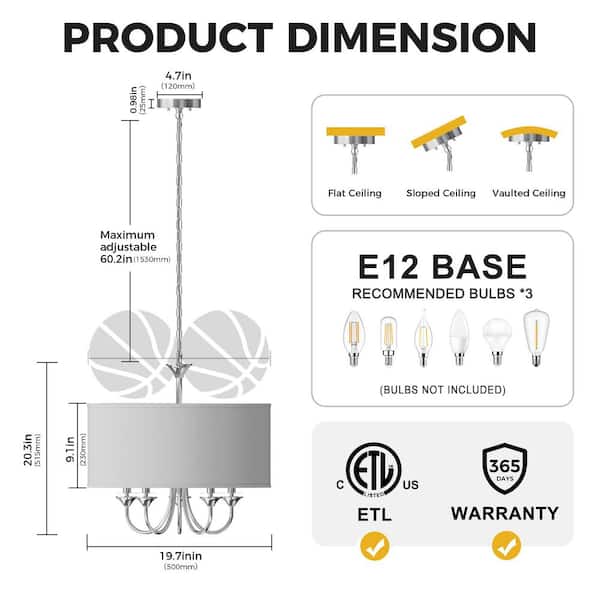 20 in. 5-Light Chrome Candle Style Empire Chandelier with Fabric Shade for Living Room