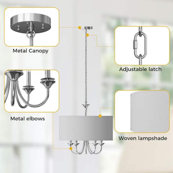 20 in. 5-Light Chrome Candle Style Empire Chandelier with Fabric Shades for Home Lighting