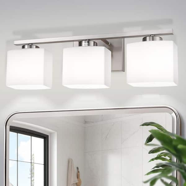 22 in. 3 Light Nickel Modern Square Vanity Light for Bathroom, Bedroom, Hallway with Milk White Glass Shades