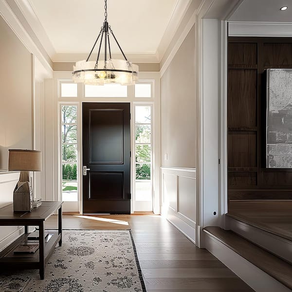 22 in. 4-Light Modern Black Drum Pendant Light with Textured Clear Glass for Dining Room, Kitchen Island