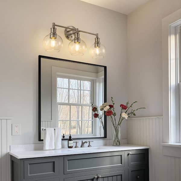 24 in. 3-Light Brushed Nickel Vanity Light with Clear Glass Globe Shades Modern Bathroom Lighting