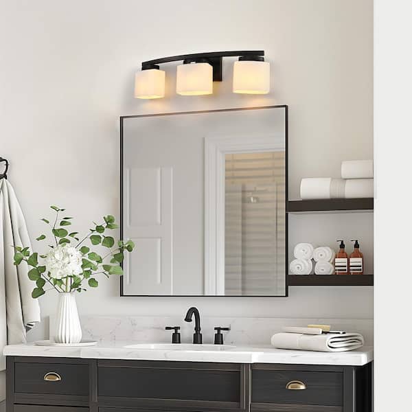 24 in. 3 Light Matte Black Modern Industrial Square Vanity Light for Bathroom with Curved Arms and Milk White Shades