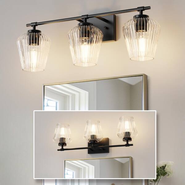 25 in. 3-Light Black Vanity Light with Clear Cone Glass Shades for Bathroom, Mirror, Hallway