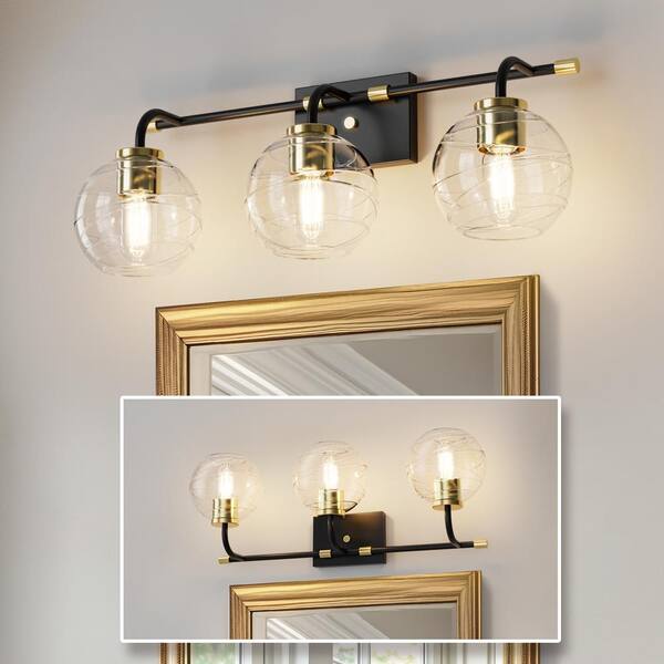 25 in. 3-Light Black Vanity Light with Globe Clear Glass Shades for Bathroom, Mirror, Living Room