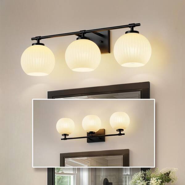 25 in. 3-Light Black Vanity Light with Milk White Globe Glass Shades for Bathroom, Living Room, Entryway