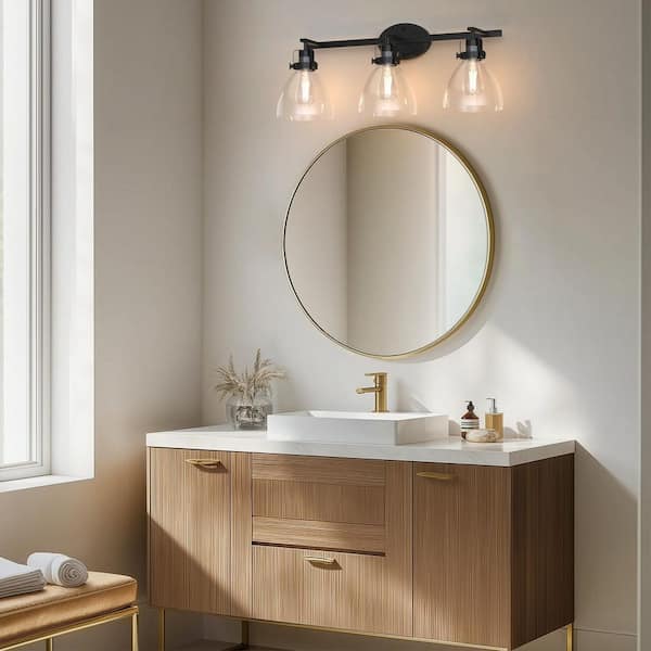 29 in. 3-Light Matte Black Vanity Light with Clear Bell Glass for Bathroom Mirror