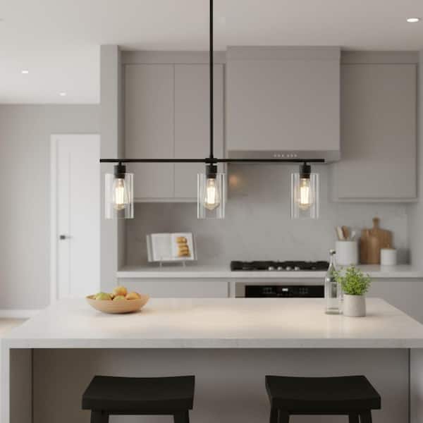3-Light Black Industrial Modern Linear Kitchen Island Pendant with Clear Glass Shades for Dining Table