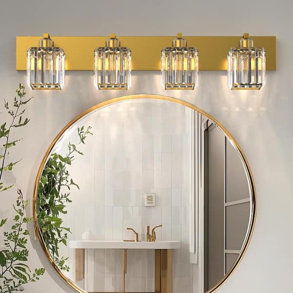 32 in. 4-Light Modern Crystal Bathroom Integrated LED Vanity Light Fixture, Gold with Clear Glass Shades