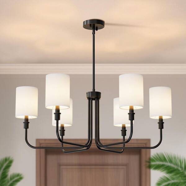 33 in. 6-Light Black Farmhouse Chandelier with White Linen Cylinder Fabric Shades