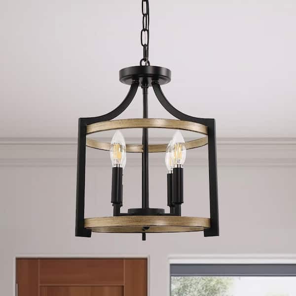 4-Light Black and Gray Wood Drum Pendant Light, Convertible Semi Flush Mount Ceilingfor Dining Room,Bedroom, Foyer