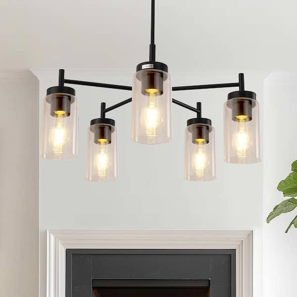 5-Light Rustic Chandelier with Clear Glass Shades - Modern Black Pendant Light Fixture for Dining Room
