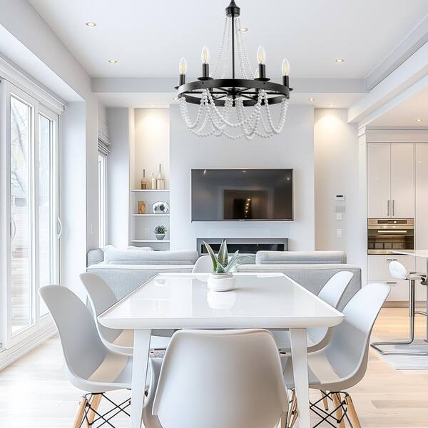 6-Light Matte Black Transitional Chandelier with White Wood Beads for Living Room (Set of 2)