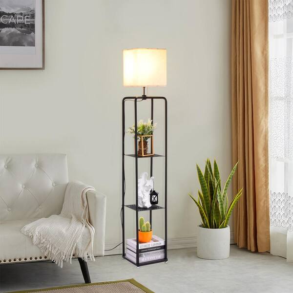 63 in. Black Floor Lamp Organizer Storage Shelf with Linen Shade