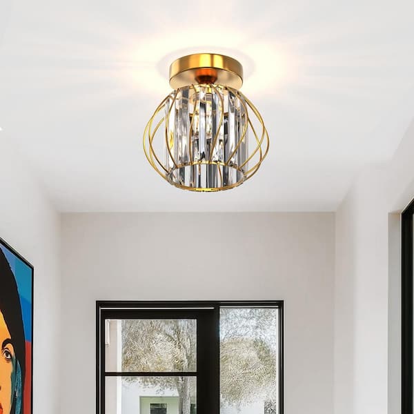 7 in. 1-Light Modern Crystal Semi Flush Mount Ceiling Light,Gold Cage Design for Hallway, Entryway, or Bedroom