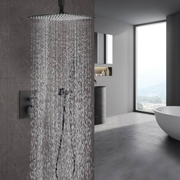 1-Spray Ceiling Mount Square Rainfall Showerhead with Hand Shower and Tub and Faucet in Matte Black