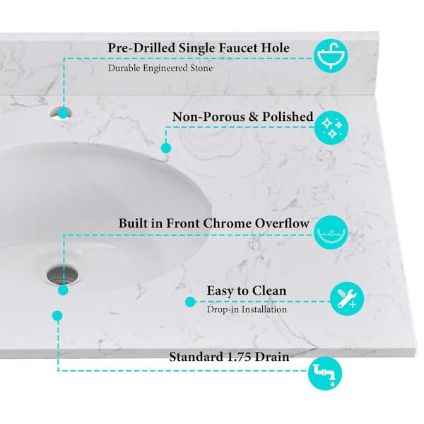 36 in. W x 21 in. D Engineered Stone Composite White Round Single Sink Vanity Top in Carrara White
