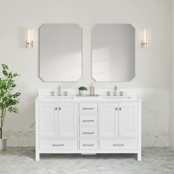 Bath Mist 60 in. W Double Sink Freestanding Bath Vanity in White with White Engineered Top