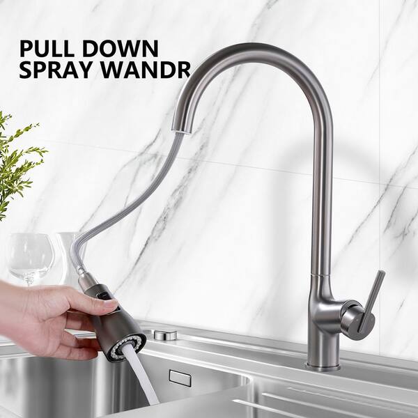 Single-Handle Deck Mount Gooseneck Pull Down Sprayer Kitchen Faucet in Matte Grey
