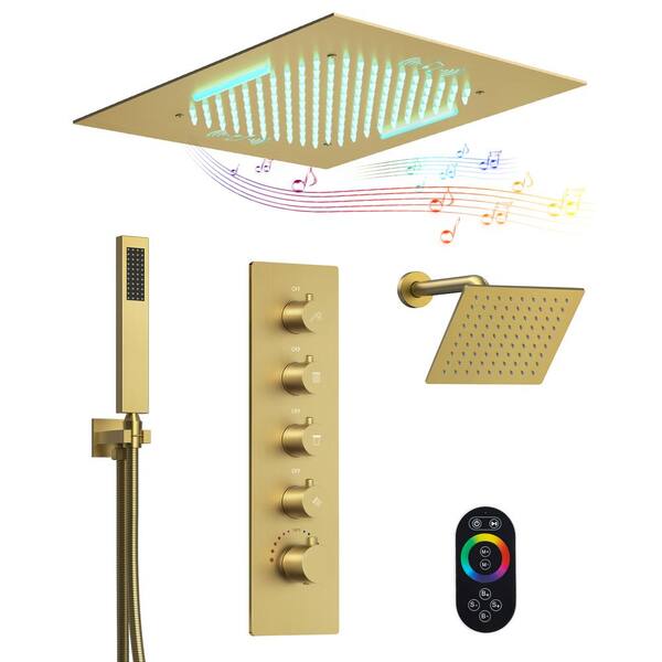 15-Spray 20 in. and 10 in. Ceiling Mount LED Mood Lighting Music Dual Shower Head and Handheld Shower in Brushed Gold