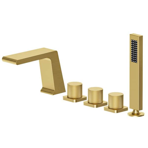 3-Handles Deck-Mount Roman Tub Faucet with Hand Shower in Brushed Gold (Valve Included)