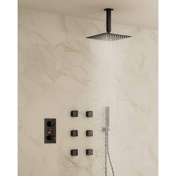 3-Spray 12 in. Ceiling Mount Dual Fixed and Handheld Shower Head and LCD Display with Valve in Matte Black