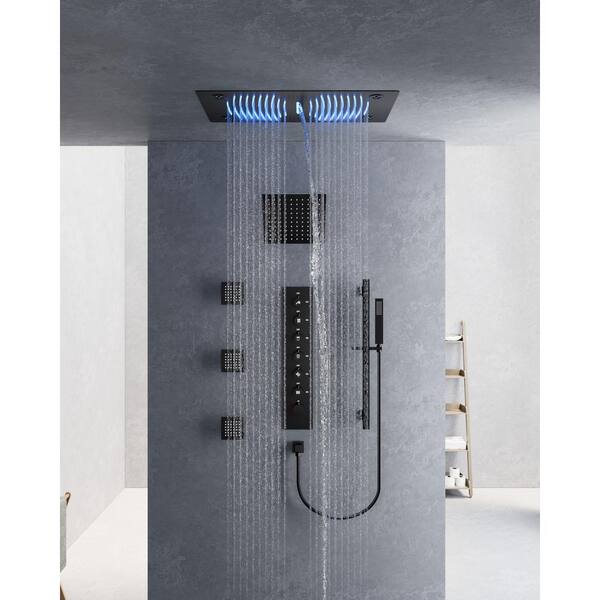 6-Spray 28x16 in. Ceiling Mount LED Mood Lighting Music Dual Shower Head and Handheld Shower Head in Matte Black