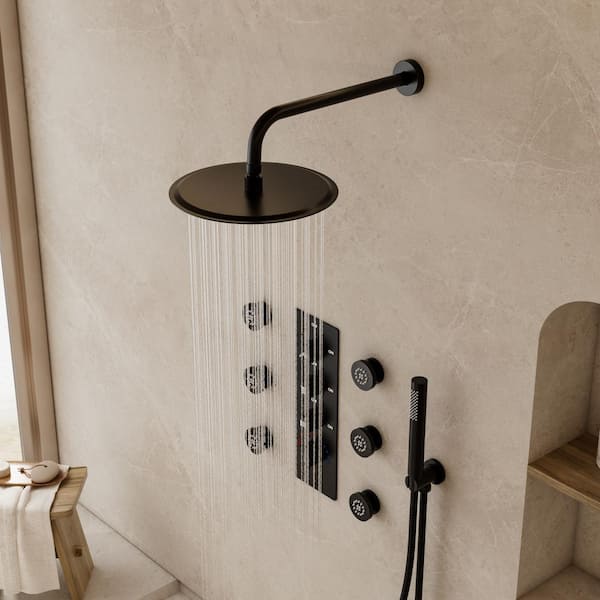 7-Spray Patterns Thermostatic 12 in. Wall-Mounted Shower Head with 6 Jets in Matte Black (Valve Included)