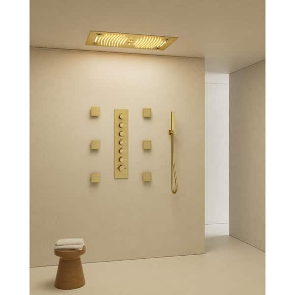 Bluetooth Music and LED Mood Lighting 6-Spray 28 in. x 16 in. Ceiling Mount Dual and Hand Shower 2.5 GPM in Brushed Gold