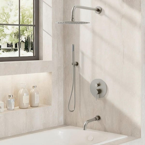 Double Handles 3-Spray 10 in. Wall Mount Shower Head Tub and Shower Faucet in Brushed Nickel (Valve Included)