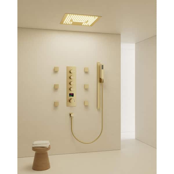 LED Mood Lighting 15-Spray 16 in. Ceiling Mount Dual and Handheld Shower 2.5 GPM with Slider Bar in Brushed Gold