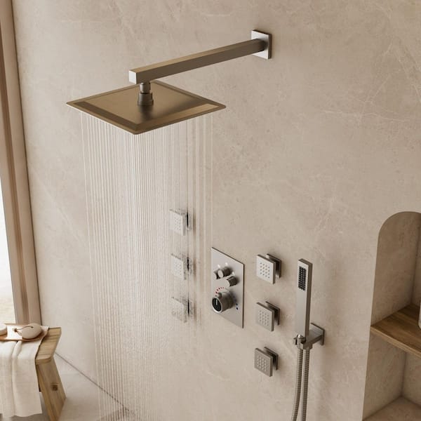 Rainspire 7-Spray 12 in. Wall Mount Square High Pressure Shower System with 6-Jets in Brushed Nickel (Valve Included)