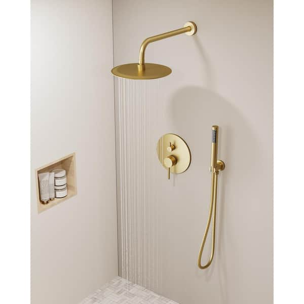 Single Handle 10 in. Round Wall Mount 2-Spray Shower Faucet with Pressure Balance Valve in Brushed Gold