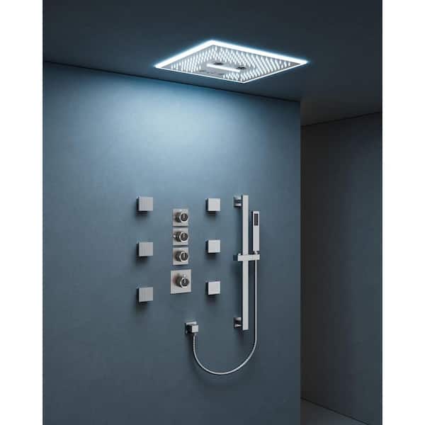 Thermostatic 17-Spray 16 in. Square LED Mood Lighting Bluetooth Music Shower System with Valve in Brushed Nickel