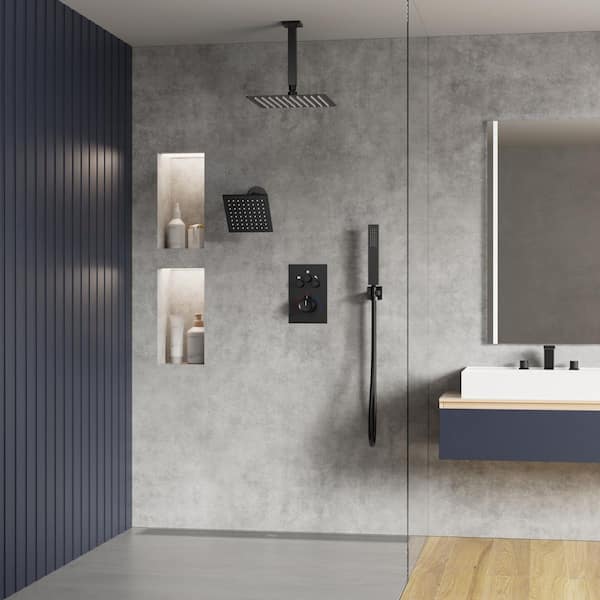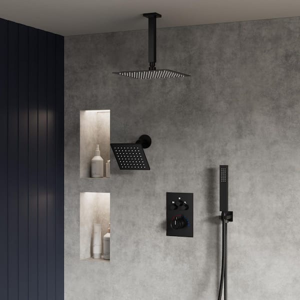 Thermostatic 7-Spray 12 in. Ceiling Mount Dual Shower Head and Handheld Shower in Matte Black (Valve Included)