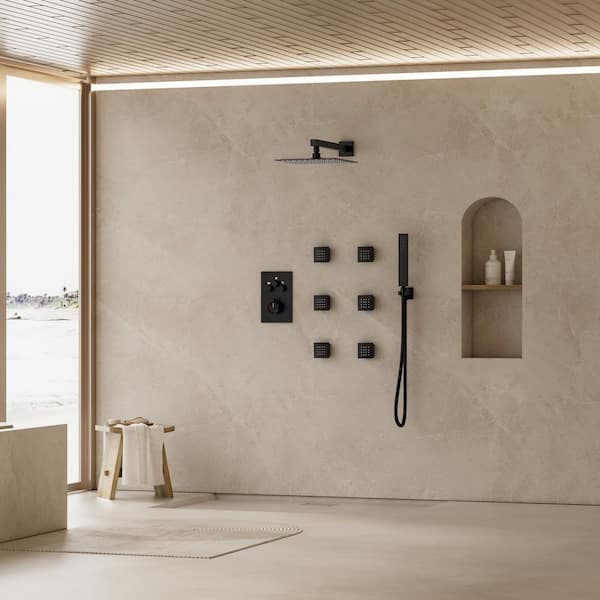 Thermostatic 7-Spray 12 in. Wall Mount Dual Shower Head and Handheld Shower in Matte Black (Valve Included)