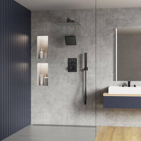 Thermostatic 7-Spray 12 in. and 6 in. Wall Mount Shower System with Hand Shower 2.5 GPM in Matte Black(Valve Included)