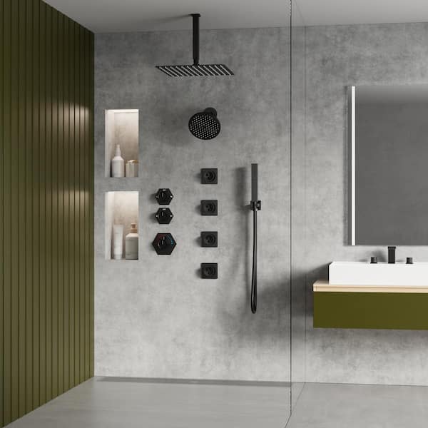 Thermostatic 8-Spray 12 and 6 in. Dual Shower Head Ceiling Mount Fixed and Handheld Shower Head in Matte Black